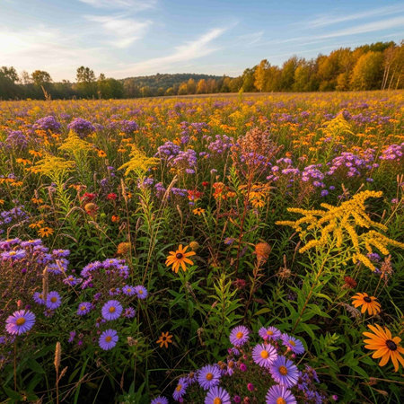 A field of colorful wildflowers in full bloom during sunset, featuring purple, yellow, and white blossoms.