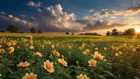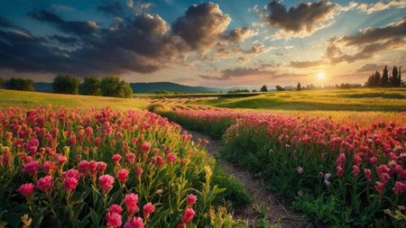 A vibrant field of colorful blooming flowers in pink, yellow, and white is bathed in the soft light of a sunrise.