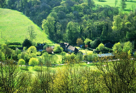 Houses and lush green trees cover a sunny suburban hillside under a blue sky. East Sussex countryside, England