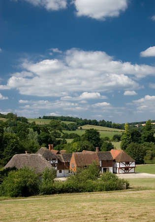 Two white houses in lush rolling scenery in the countryside under a blue cloudy sky on a sunny summers day.