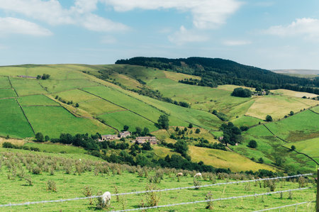 Lush green English countryside with farm buildings and sheep grazing in rolling pastures.