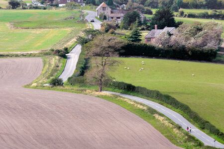 Scenic view of village and farms from Mendip Hills, UK, on a sunny autumn day.