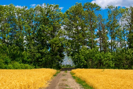 Photo of dirt road on beautiful wheat field with trees and sky at summer