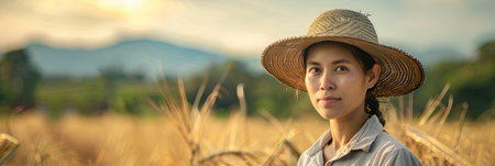Young asian woman farmer in wheat field at sunset. Agriculture concept.