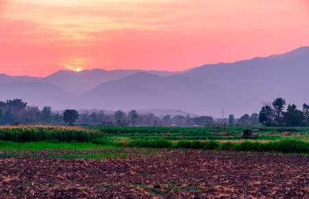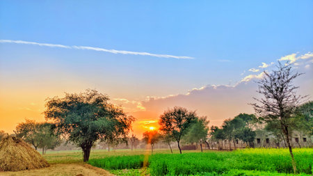 Beautiful golden sunrise rays view with attractive green field. Nature concept.