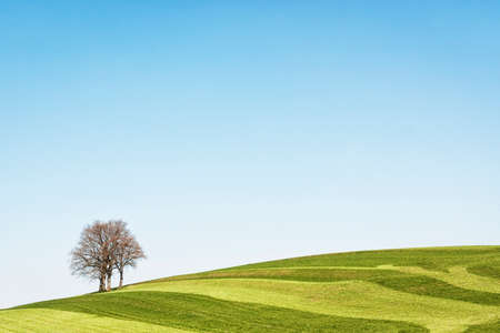 Trees are standing on a fresh green field. Nobody, idyllic landscape scenery