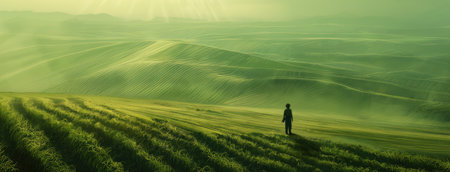a hunter, equipped with binoculars and a map, scouting a vast glass agricultural field, where rows of crops extend into the distance, painting a scene of exploration and anticipation