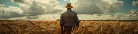 A farmer is shown working with crops in a field, possibly planting or tending to them. The image displays a vibrant composition with green plants and rich brown earth, illuminated by sunlight piercing through dark clouds. This scene could be used to represent agriculture, farming practices, or environmental themes in various media.