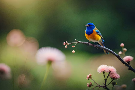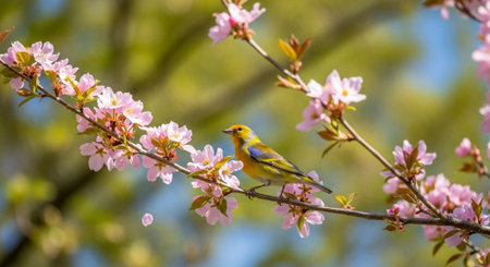 A blue and yellow bird is perched on a branch of a pink flower. Concept of tranquility and beauty, as the bird is surrounded by the delicate pink blossoms. The scene evokes a feeling of peace