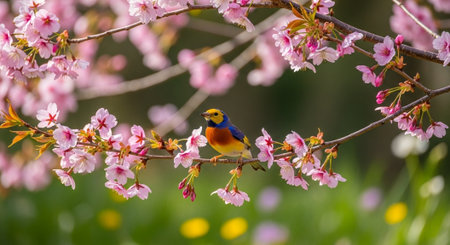 Vibrant bird perched amongst blooming pink cherry blossom branches