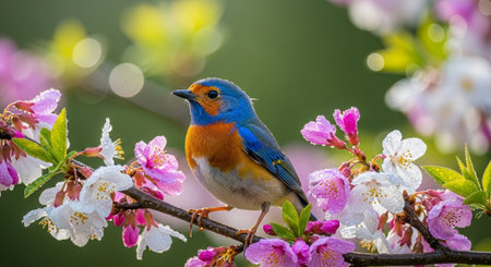 A vibrant bluebird with orange breast feathers perches on a flowering branch. The bird opens its beak, suggesting a song. Pink cherry blossoms and soft green foliage create a natural environment. The composition features a shallow depth of field, suitable for various editorial and commercial purposes.