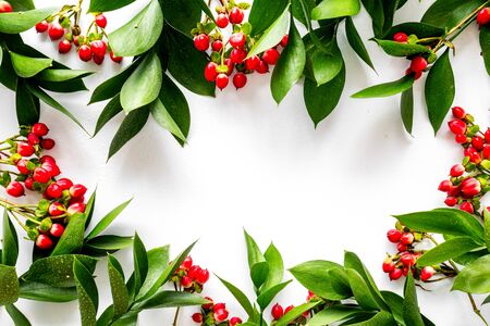 Summer design. Green leaves and red berries frame on white background top view copyspace