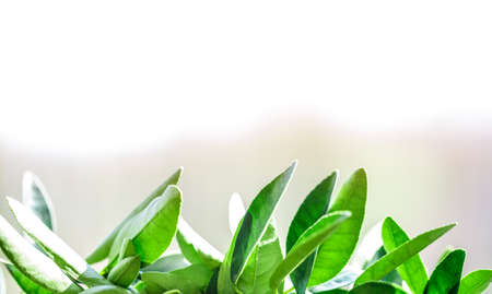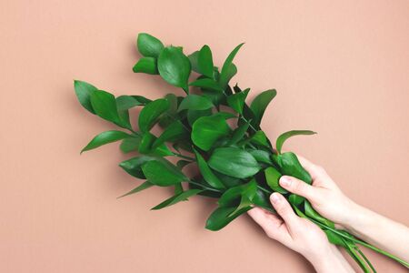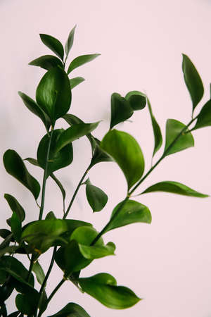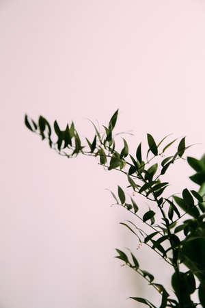 Green leaves of plant branches on a neutral background, minimalism and space for text
