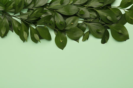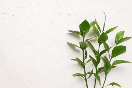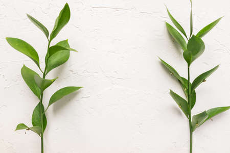 Branches with fresh green Ruscus leaves on white concrete textured background. Floral frame with copy space