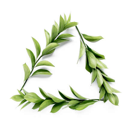 triangle frame with green leaves and branches isolated on white background. lay flat, top view