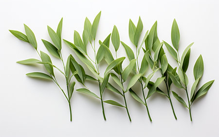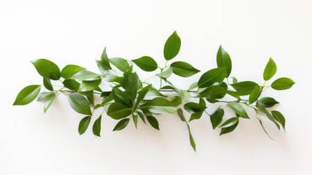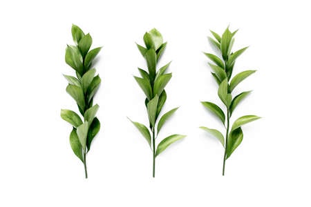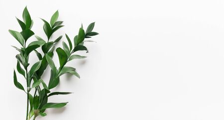One branch with green leaves on white background. Minimal clean flat lay arrangement of fresh greens.