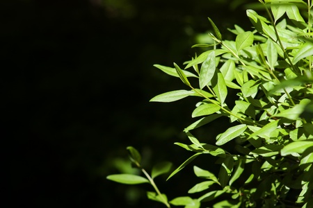 Natural green twigs with leaves on gray background. There is a place for your text or logo.