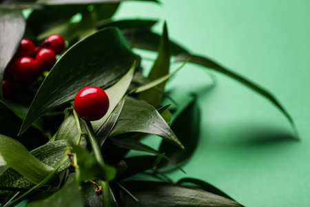 Beautiful handmade mistletoe wreath with red berries on green background, closeup. Traditional Christmas decor