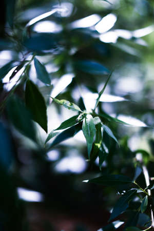 Dark green leaves background. Juicy glossy leaves. Stylish natural background. Bright lush foliage