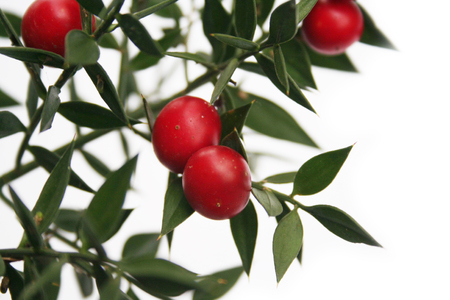 Ruscus aculeatus butcher's broom, knee holly or piaranthus small sharp-leaved shrub with deep red berries and tiny flowers on natural background flash lighting
