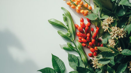 Fresh okra pepper alongside colorful vegetables displays natural beauty on a white surface.