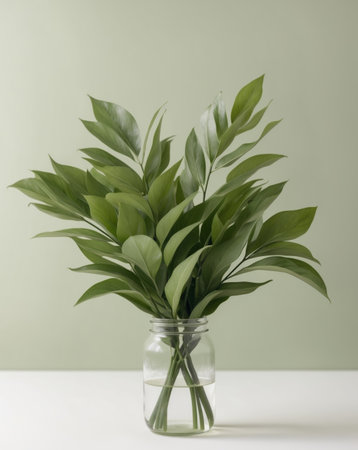 AI Generated. Green Leaves in Glass Jar on Green Background