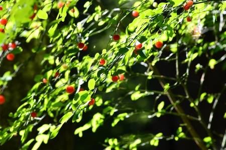 Small cranberry leaves in a dark forest. Background, dark light.