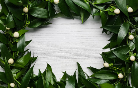 Beautiful handmade mistletoe wreath on white wooden table. Space for text