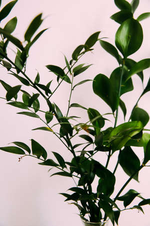 Simple green background of plants , Fresh green branches of Ruscus on a neutral background, side view, space for text