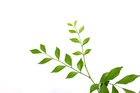 Summer background. Young sprig with green foliage on white top view.