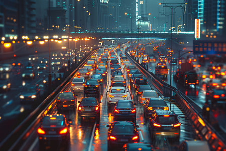 A vivid portrayal of an evening traffic jam showcasing a busy urban environment, with bright brake lights illuminating the cars and setting a dynamic evening scene.