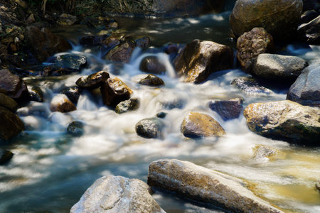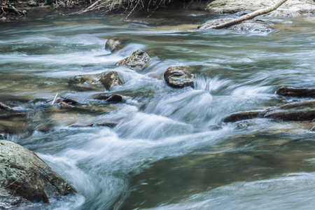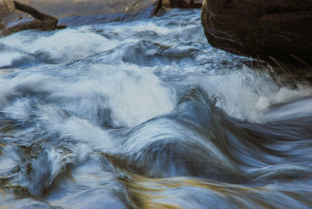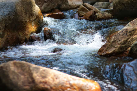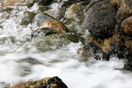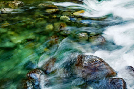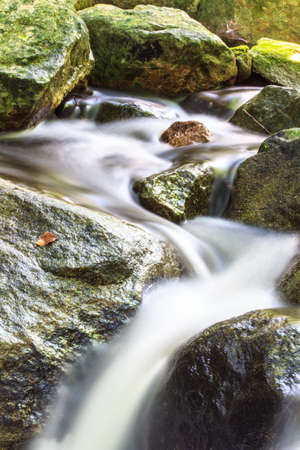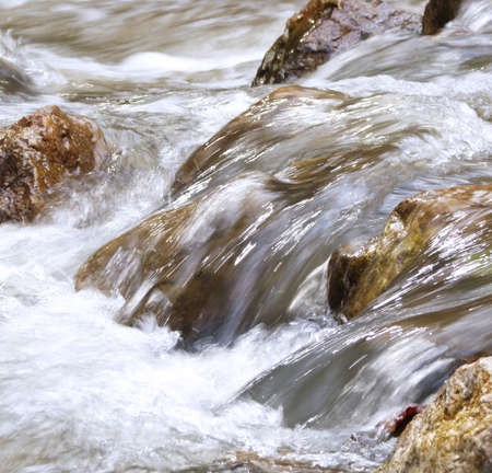 Water flowing over rocks in a stream. Motion blur. Abstract background.