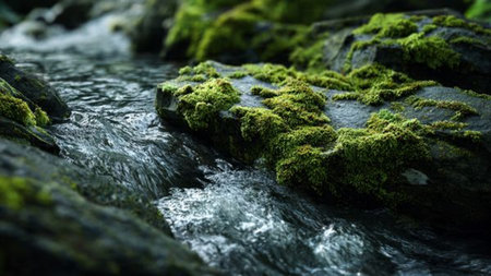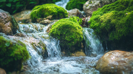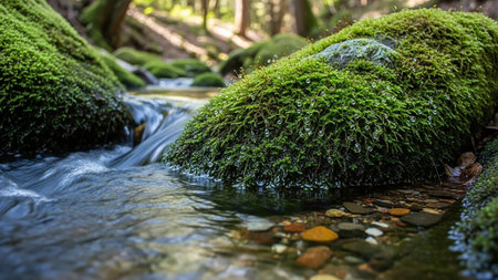 A close-up view of vibrant green moss-covered rocks with water droplets beside a gently flowing forest stream with visible pebbles.