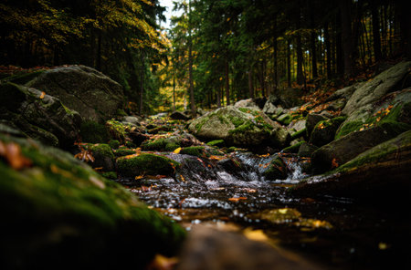 A tranquil stream flows gently through a vibrant autumn forest. Golden leaves and moss-covered rocks create a peaceful atmosphere, highlighting nature's beauty.