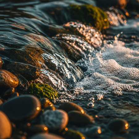 A close-up of rounded stones in a river, with water gently lapping against them, creating a peaceful and natural scene perfect for outdoor photography