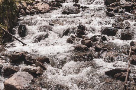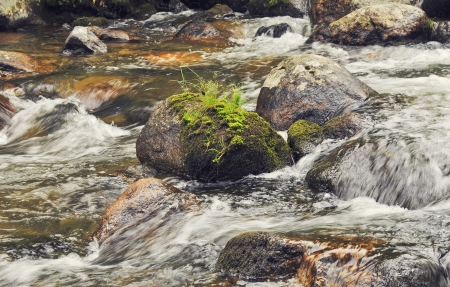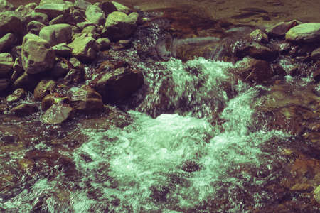 Streaming water in a mountain river. Beautiful natural background. Toned.