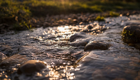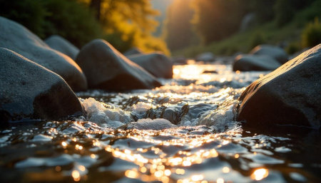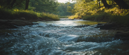 Clear, flowing stream rushing over rocks in dappled sunlight, nature's beauty