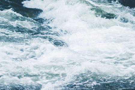 Nature background of dark water stream of mountain river with rapids. Full frame of sea surf. Natural textured backdrop of ocean surf. Texture of tide close-up. Dark water surface of mountain creek.