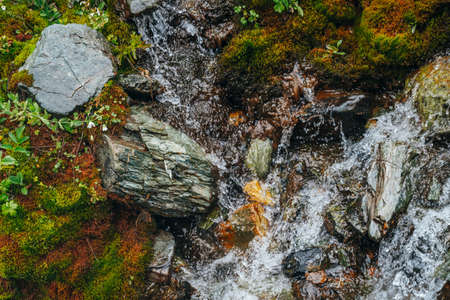 Scenic background with clear spring water stream among thick moss and lush vegetation. Mountain creek on mossy slope with fresh greenery and many small flowers. Colorful backdrop of rich alpine flora.