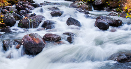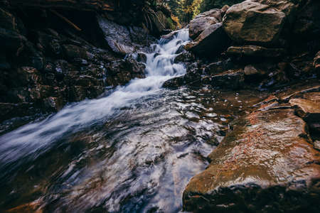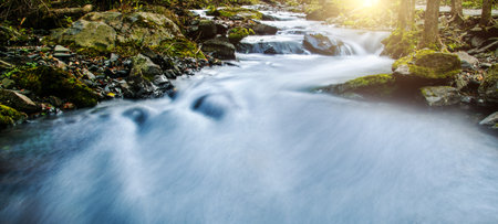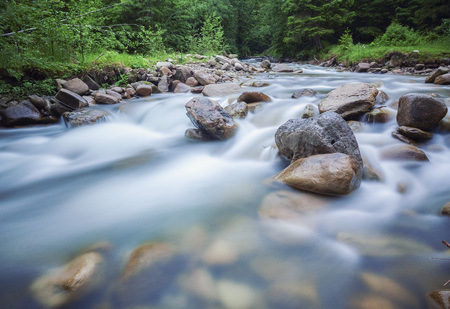 Long exposure of a fast flowing mountain river with rocks and stones.