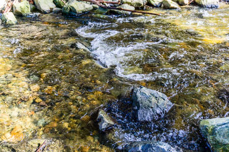 Mountain stream with yellow stones. Rapid flow of river, boiling water