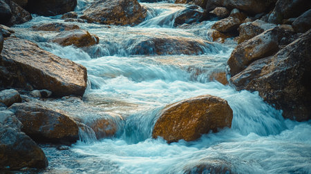 Vibrant blue streams cascade swiftly over rugged rocks, creating lively splashes that emphasize movement and vitality within a pristine, natural setting.
