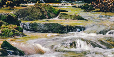 Mountain river, cold rushing water flows between green rocks. The stones are covered with green vegetation.