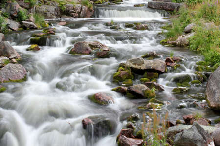 Fast northern river flowing over rocks, photo with long exposure, beautiful natural background