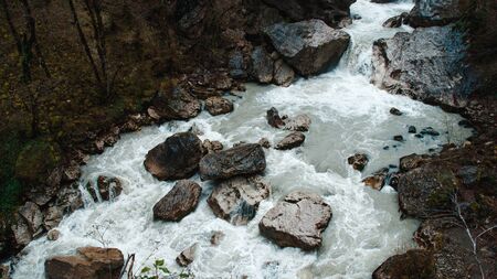 Raging water of a fast mountain river in a picturesque beautiful mountainous area, flowing water with splashes, selective focus close-up