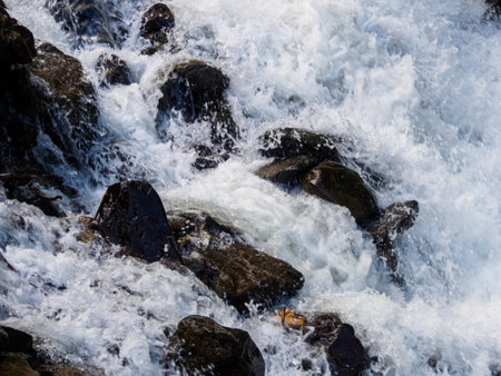 Mountain river with small waterfall with clear turquoise water falling down between wet boulders with thick white foam.