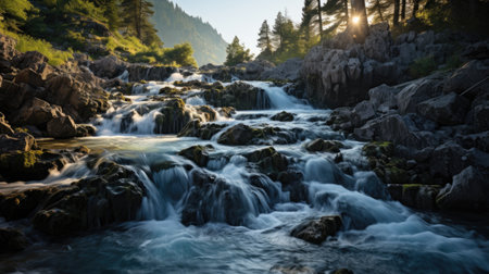 A mountain river with a rapid flow: a mesmerizing stream of water, framed by picturesque mountain landscapes and green slopes.