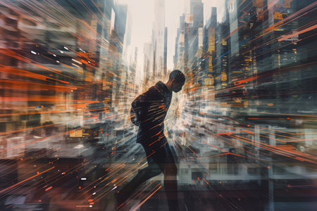 A businessman races through a vibrant urban landscape, embodying speed and determination in a blurred city scene, symbolizing effective and quick solutions in a modern world.