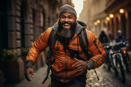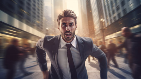 Energetic Businessman Running on Busy City Street. Generative ai. High quality illustration