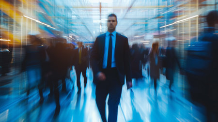 A businessman in a suit runs rapidly through a stylish office, papers scatter around him, showing the urgency of corporate life and ambition.